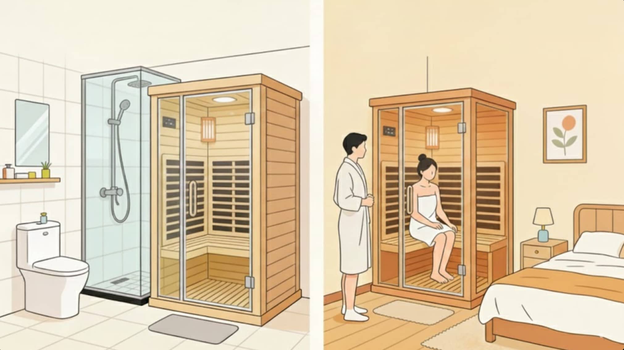 設置スペース: スチームサウナは給水および排水パイプを確保する必要があり、空間の気密性に対する高い要件があります (バスルームの改修または専用エリアに適しています)。遠赤外線サウナは給排水不要で電源のみ。小型の一人用モデルはわずか0.5~1㎡のスペースを占有し、寝室やバルコニーに柔軟に設置できます。